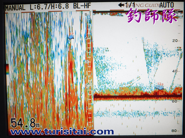 魚はぶち居ました。喰いっ放しの入れ食い爆釣! 魚探は真っ赤っかです。