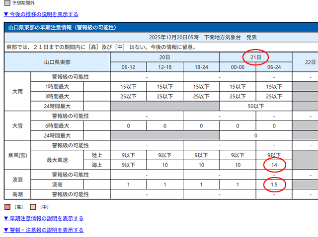 21日は風速14m、波高1.5m予報です。しかも冷たい雨。