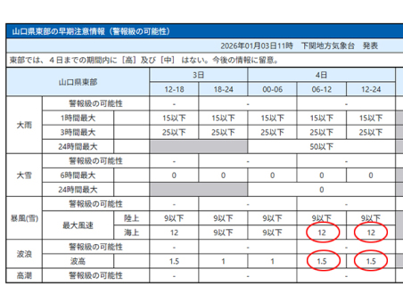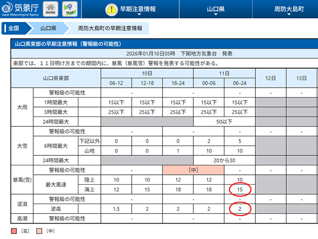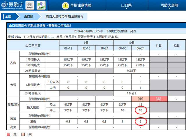 最強寒波で波高2〜2.5m、風速15〜18mにも達する予報。