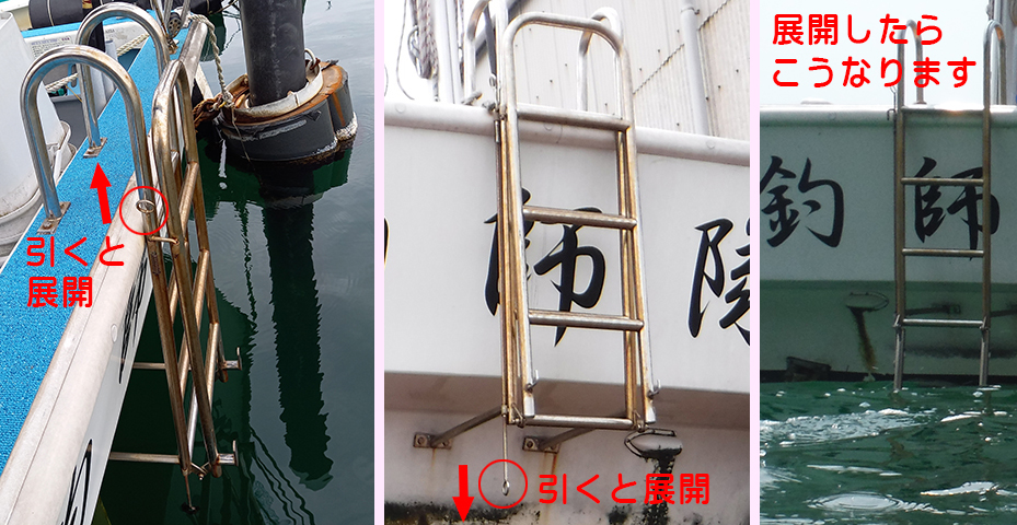 ・落水者救助用ハシゴを常設。水中からもレバーを引けば展開。