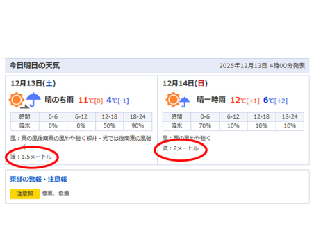 14日は波高2m風速15mの荒天予報につき中止です。